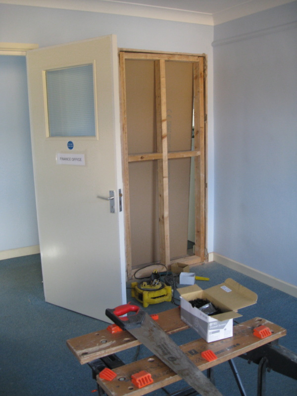 The group also recycled the old stud timbers to form a new stud infill where the superfluous office door had been removed. This will soon be covered with plasterboard both sides and skimmed with plaster.